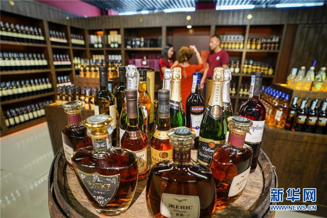 在中哈霍爾果斯國(guó)際邊境合作中心,游客在一家哈薩克斯坦酒商開設(shè)的店鋪里選酒(7月11日攝)。新華社記者 趙戈 攝