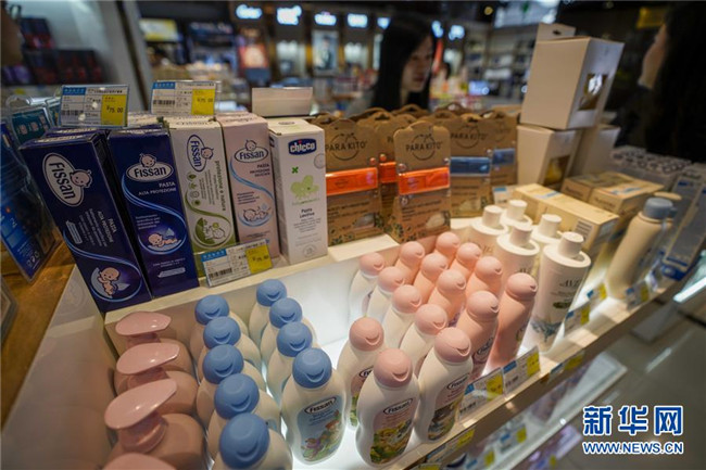 游客在中哈霍爾果斯國(guó)際邊境合作中心一家免稅店挑選化妝品(7月11日攝)。新華社記者 趙戈 攝