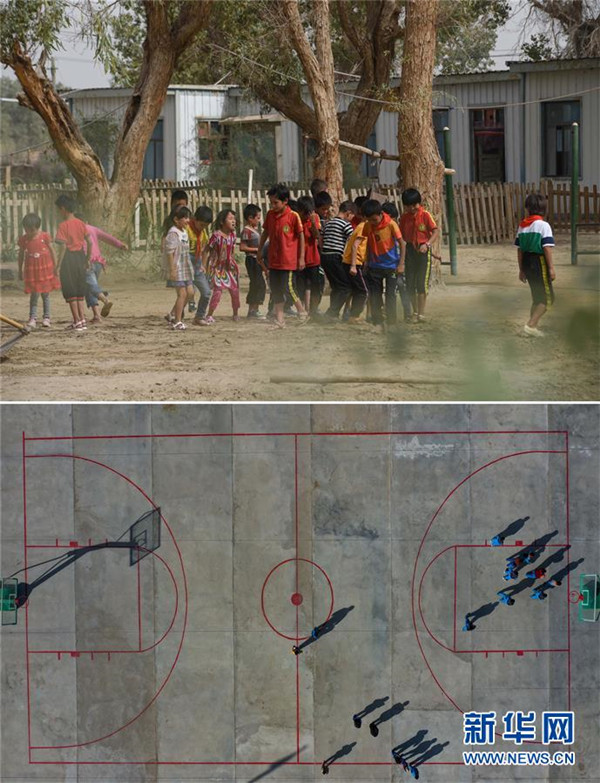 拼版照片:上圖為學(xué)生利用課間時間在平整易地扶貧搬遷前的校園操場(2018年9月6日攝);下圖為學(xué)生們在于田縣達(dá)里雅布依鄉(xiāng)易地扶貧搬遷安置點的水泥操場上打籃球(2019年11月19日無人機(jī)拍攝)。新華社記者胡虎虎攝