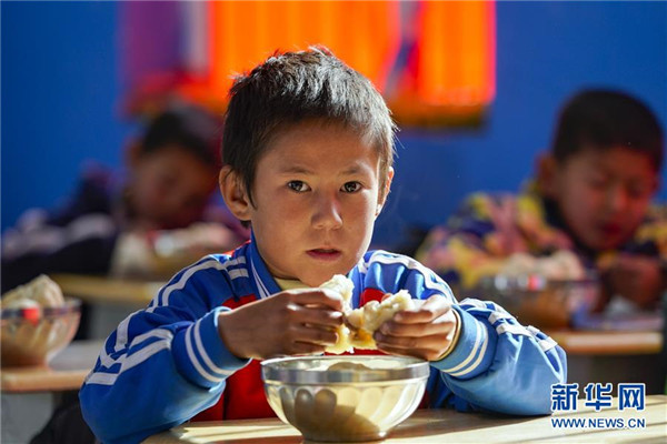 11月19日,在新疆于田縣達(dá)里雅布依鄉(xiāng)易地扶貧搬遷安置點的新學(xué)校,一年級學(xué)生在學(xué)校里吃免費午餐。新華社記者沈伯韓攝