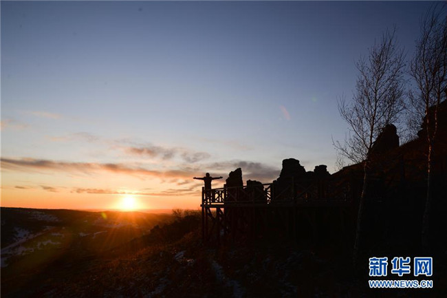 這是11月25日拍攝的克什克騰石陣景區(qū),一名游客張開雙臂面向夕陽(yáng)。