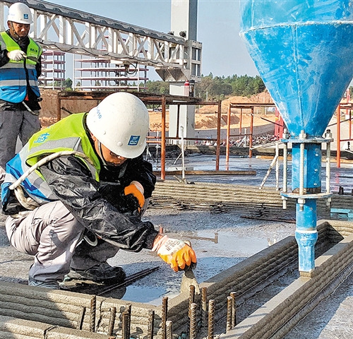 施工人員在3D打印墻體施工中。(圖片由中建二局華南公司提供)