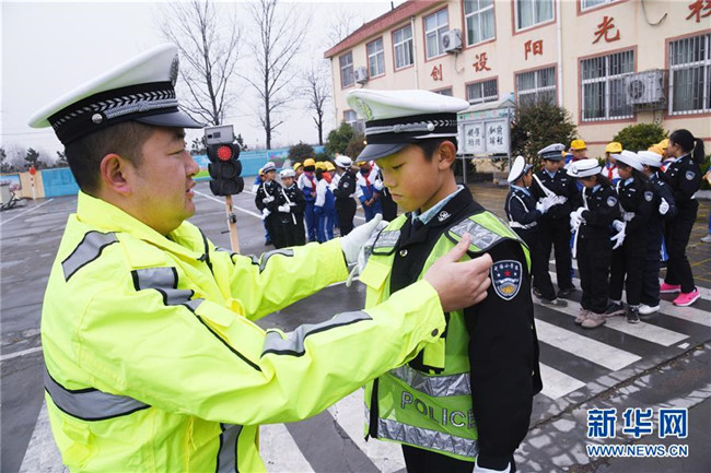 12月1日,東皋埠小學(xué)“小小交警隊(duì)”隊(duì)員們?cè)诎踩逃顒?dòng)中整理“警容”。新華社記者 李紫恒攝