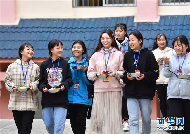 12月5日,在廣西融水苗族自治縣保桓中學(xué),林洋港(左四)和學(xué)生們從食堂打飯出來。林洋港是西北工業(yè)大學(xué)的在讀碩士研究生,今年9月來到融水苗族自治縣?;钢袑W(xué)任物理老師。新華社記者 黃孝邦 攝