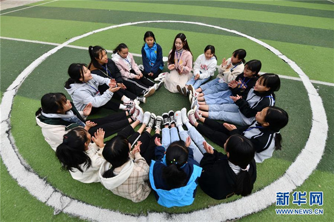 12月5日,在廣西融水苗族自治縣?;钢袑W(xué),林洋港(正面中,粉色衣服)和學(xué)生們?cè)谇驁?chǎng)上唱歌。林洋港是西北工業(yè)大學(xué)的在讀碩士研究生,今年9月來到融水苗族自治縣保桓中學(xué)任物理老師。 新華社記者 黃孝邦 攝