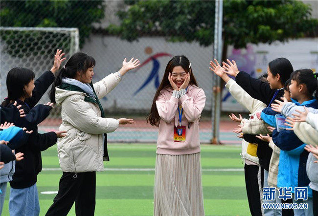 12月5日,在廣西融水苗族自治縣?;钢袑W(xué),林洋港(右三)和學(xué)生們?cè)谇驁?chǎng)上玩游戲。林洋港是西北工業(yè)大學(xué)的在讀碩士研究生,今年9月來到融水苗族自治縣保桓中學(xué)任物理老師。新華社記者 黃孝邦 攝