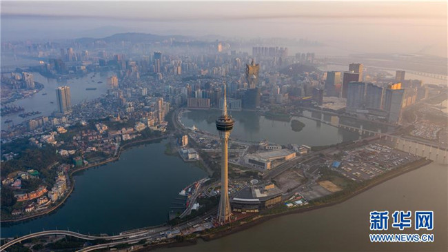 11月18日無人機(jī)拍攝的澳門旅游塔、西灣湖、南灣湖景色。新華社記者 張金加 攝