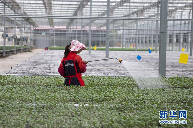 12月18日,在于都縣禾豐鎮(zhèn)一家富硒蔬菜種植基地,農民在給蔬菜幼苗澆水。新華社記者 張浩波 攝