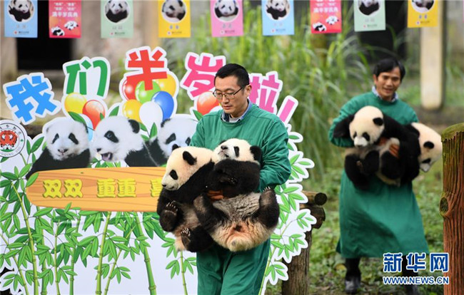 12月22日,重慶動物園4只半歲大熊貓在戶外活動。當日,重慶動物園為4只大熊貓寶寶“雙雙”“重重”“喜喜”“慶慶”舉行半歲生日慶?;顒印?只半歲大熊貓在飼養(yǎng)員的照料下,在熊貓館運動場內(nèi)玩耍、嬉戲,與市民游客一同過冬至。新華社記者唐奕攝