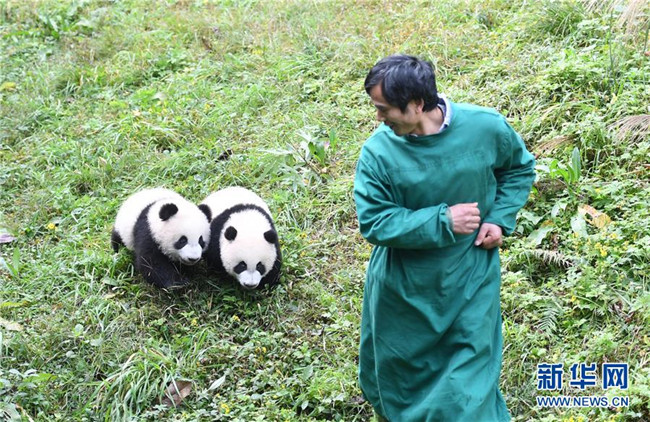 12月22日,飼養(yǎng)員引導兩只半歲大熊貓在戶外運動。當日,重慶動物園為4只大熊貓寶寶“雙雙”“重重”“喜喜”“慶慶”舉行半歲生日慶?;顒印?只半歲大熊貓在飼養(yǎng)員的照料下,在熊貓館運動場內(nèi)玩耍、嬉戲,與市民游客一同過冬至。新華社記者唐奕攝