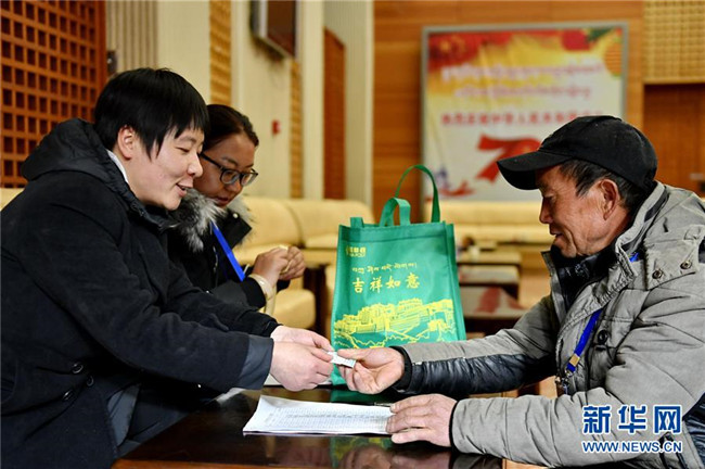 12月23日,在拉薩火車站,一名受助務(wù)工人員(右)從中國郵政集團(tuán)公司西藏自治區(qū)分公司工作人員手中接過火車票。新華社記者 張汝鋒 攝