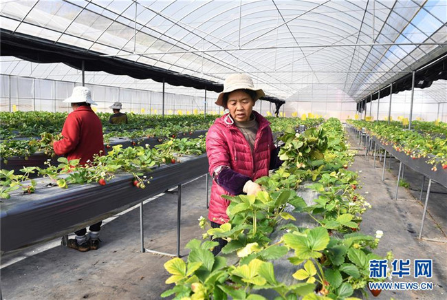 1月9日,云南省富民縣散旦鎮(zhèn)漢營(yíng)村農(nóng)民在草莓種植基地剪枝。 新華社記者楊宗友攝
