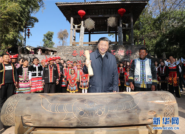 春節(jié)前夕,中共中央總書記、國(guó)家主席、中央軍委主席習(xí)近平赴云南考察,看望慰問(wèn)基層干部群眾。這是1月19日下午,習(xí)近平來(lái)到騰沖市清水鄉(xiāng)三家村中寨司莫拉佤族村,向大家送上新春祝福。 新華社記者 鞠鵬 攝
