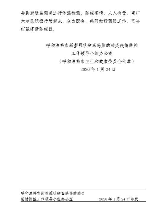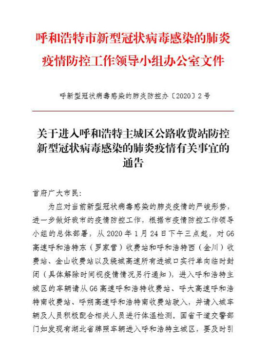 記者從呼和浩特市新型冠狀病毒感染的肺炎疫情防控工作領導小組辦公室獲悉,為應對當前新型冠狀病毒感染的肺炎疫情的嚴峻形勢,進一步做好呼和浩特市的疫情防控工作。從2020年1月24日下午三點起,對G6高速呼和浩特東(羅家營)收費站和呼和浩特西(金川)收費站、金山收費站以及繞城高速所有進城口實行單向臨時封閉(具體解除時間視疫情情況另行通知)。進入呼和浩特主城區(qū)的車輛請從G6高速呼和浩特收費站、呼大高速呼和浩特南收費站、呼朔高速呼和浩特南收費站駛?cè)?,并請入城車輛及人員積極配合相關人員進行體溫檢測。