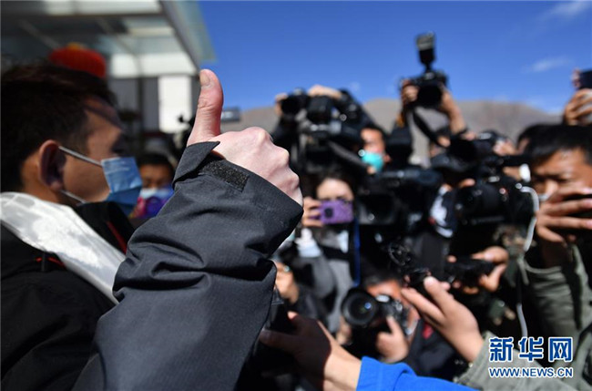 2月12日,在西藏自治區(qū)第三人民醫(yī)院,西藏唯一新冠肺炎患者治愈出院后豎起大拇指感謝醫(yī)護(hù)人員。新華社記者 覺果 攝