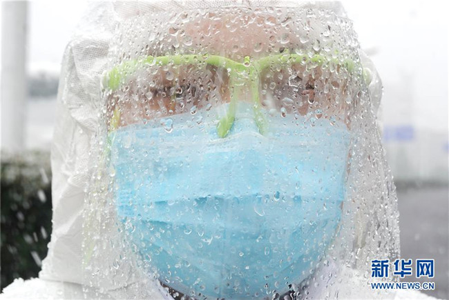 在武漢客廳方艙醫(yī)院,武漢市公安局東西湖區(qū)交通大隊快騎隊警務(wù)人員在現(xiàn)場執(zhí)勤。由于雨雪天氣,護(hù)目鏡上滿是霧水(2月15日攝)。 新華社記者 才揚 攝