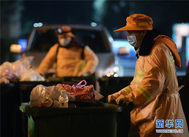 江岸環(huán)衛(wèi)集團(tuán)工作人員在武漢街頭清運社區(qū)生活垃圾(2月1日攝)。 新華社記者 李賀 攝