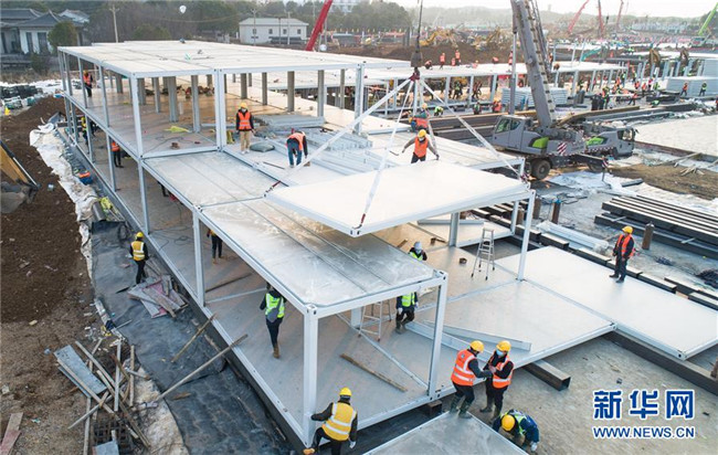 在武漢火神山醫(yī)院建設(shè)工地,來自中建三局的工人在加緊施工(1月28日攝,無人機(jī)照片)。 新華社記者 肖藝九 攝