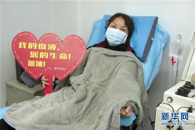在武漢血液中心的中國醫(yī)學(xué)科學(xué)院CPnCoV項目組,康復(fù)病人、來自漢口醫(yī)院的護(hù)士蔡桃英在獻(xiàn)血漿時拍照留念。她說同事們都在一線忙碌,她獻(xiàn)血漿后,再休息幾天就準(zhǔn)備回到崗位上班,她說自己感染是由于早期防護(hù)不足經(jīng)驗不夠造成的,再次回到工作崗位一定沒有問題(2月17日攝)。 新華社記者 才揚 攝