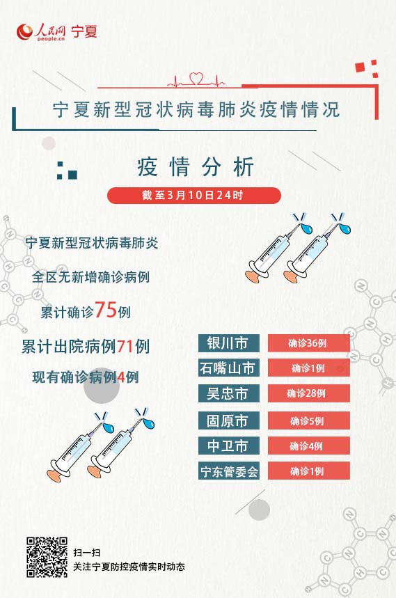 截至3月10日24時,全區(qū)現有確診病例4例,累計出院病例71例。全區(qū)累計報告確診病例75例,其中銀川市36例,石嘴山市1例,吳忠市28例,固原市5例,中衛(wèi)市4例,寧東1例。全區(qū)無疑似病例。
