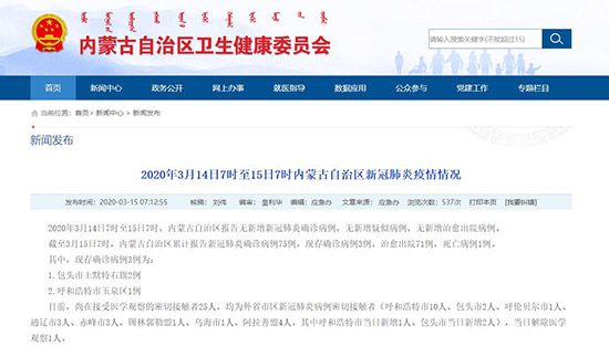 截至3月15日7時(shí),內(nèi)蒙古自治區(qū)累計(jì)報(bào)告新冠肺炎確診病例75例,現(xiàn)存確診病例3例,治愈出院71例,死亡病例1例。