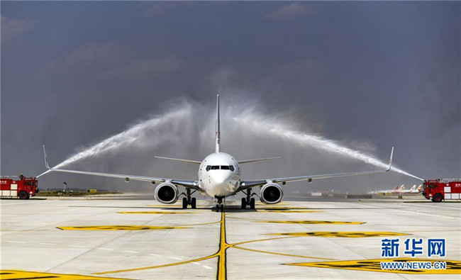 3月22日,云南省援鄂醫(yī)療隊(duì)乘坐的飛機(jī)通過水門。新華社記者 江文耀 攝