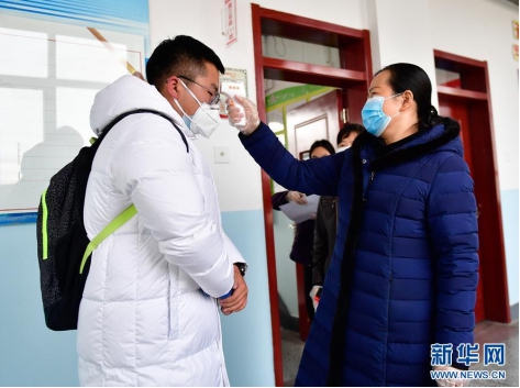 3月9日,在青海省海東市第二中學,學生進入教室前進行測溫。