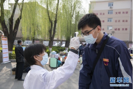 3月25日,在位于太原市財貿(mào)學校的太原市第五十三中學校高三教學點,學生接受體溫測量。