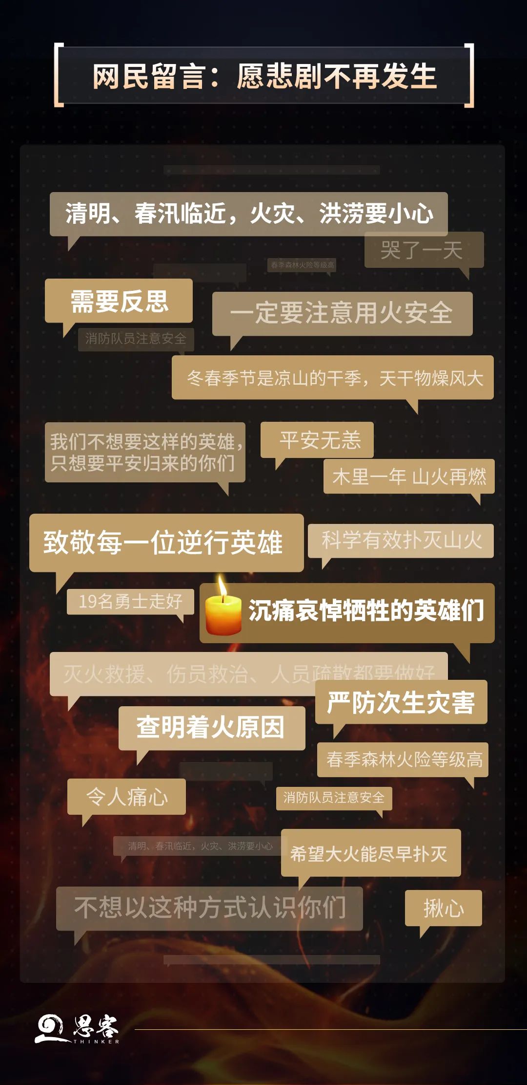 “火災(zāi)”“英雄”“反思”是網(wǎng)民留言中的高頻詞,“我們不想要這樣的英雄,只想要平安歸來(lái)的你們”成為網(wǎng)民共同心聲。逆火而行的英雄值得尊敬,但確保撲火人員安全更是前提。有網(wǎng)民說(shuō),一年前,四川木里的那場(chǎng)大火,造成31人不幸犧牲;一年后,又是一場(chǎng)大火,再次奪走19條鮮活的生命。春天天干物燥、山火肆虐蔓延、風(fēng)向突然變化,兩次火災(zāi)場(chǎng)景何其相似。我們需要認(rèn)真反思,加大對(duì)風(fēng)向突變的預(yù)判,利用更多科技手段滅火,避免火災(zāi)“風(fēng)”險(xiǎn)悲劇重演。
