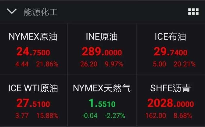 4月2日,國際原油期貨價(jià)格出現(xiàn)暴漲,美國WTI原油期貨盤中最高漲超30%,布倫特原油期貨盤中最高漲超46%。截至收盤,美國WTI 原油期貨價(jià)格漲幅24.67%,報(bào)25.32美元/桶;布倫特原油期貨漲幅21.02%,報(bào)29.94美元/桶,均為史上最大單日漲幅。(張旭)