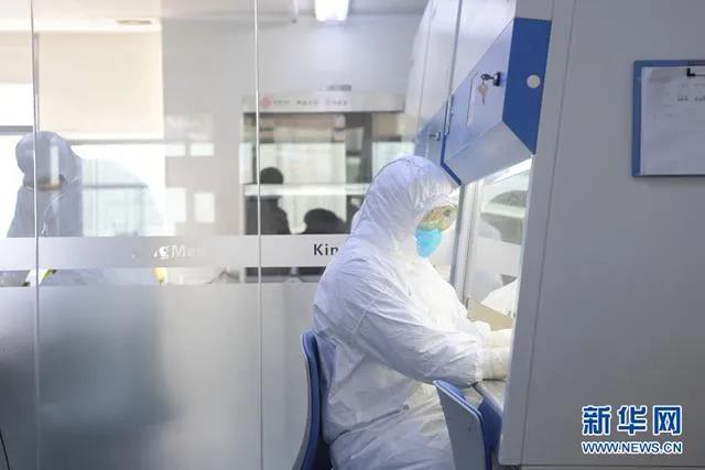 ▲實(shí)驗(yàn)室檢驗(yàn)人員在生物安全柜里面操作,對(duì)核酸樣本進(jìn)行提取。圖片來源:新華網(wǎng)