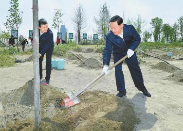 四月八日,四川省委書記彭清華到成都市調(diào)研公園城市建設(shè)推進(jìn)情況。在天府中央公園,彭清華與天府新區(qū)干部群眾一起植樹造林,為公園城市建設(shè)再添一抹綠、貢獻(xiàn)一份力。記者 歐陽杰 攝