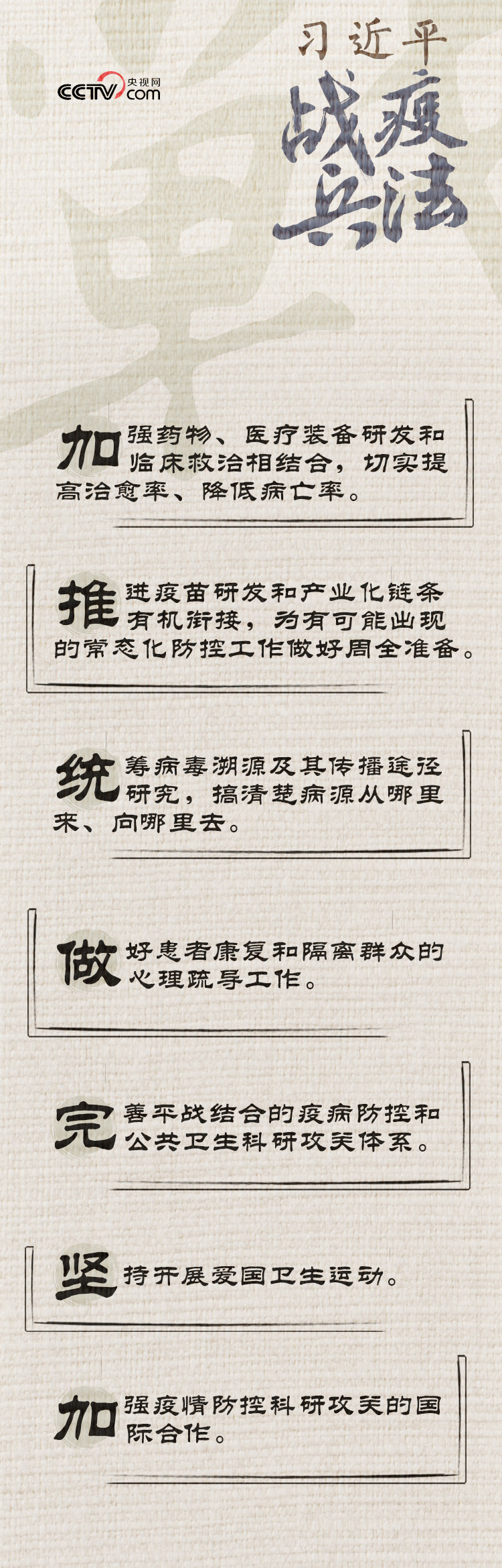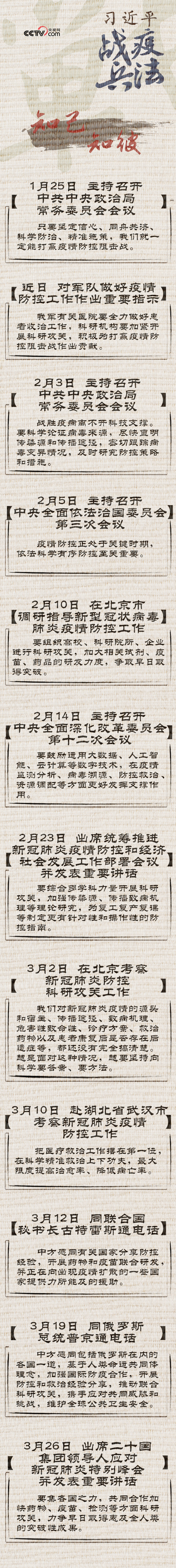習近平從疫情防控之初就將科學防控放在了重要位置,從“堅定信心、同舟共濟、科學防治、精準施策”的總要求,到“加大科研攻關力度”的反復叮囑,再到“搞清楚病源從哪里來、向哪里去”的關切,科學防控始終是習近平戰(zhàn)“疫”部署的一條鮮明主線。