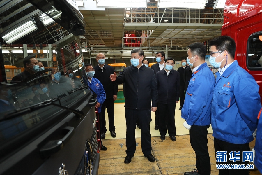 22日,習近平在西安考察復工復產(chǎn)和經(jīng)濟社會恢復運行等情況。陜西汽車控股集團有限公司是西北地區(qū)有影響力的制造企業(yè)。習近平詳細了解產(chǎn)品研發(fā)、生產(chǎn)、銷售和復工復產(chǎn)情況,對他們克服疫情影響創(chuàng)產(chǎn)銷歷史新高表示贊賞??傃b車間內(nèi)一片繁忙景象。習近平察看內(nèi)飾生產(chǎn)線、總裝配生產(chǎn)線,饒有興致登上裝配完成的民用重型卡車駕駛室,向技術(shù)人員詢問產(chǎn)品性能和操作流程。習近平強調(diào),制造業(yè)是國家經(jīng)濟命脈所系。國有大型企業(yè)要發(fā)揮主力軍作用,在抓好常態(tài)化疫情防控的前提下,帶動上下游產(chǎn)業(yè)和中小企業(yè)全面復工復產(chǎn)。習近平指出,新時代陜西要有勇立潮頭、爭當時代弄潮兒的志向和氣魄,既要抓住西部大開發(fā)、共建“一帶一路”等重大機遇,又要善于從眼前的危機和挑戰(zhàn)中搶抓和創(chuàng)造機遇,不斷發(fā)展新模式、新業(yè)態(tài)、新技術(shù)、新產(chǎn)品,創(chuàng)造新的更大業(yè)績,邁上新的臺階。