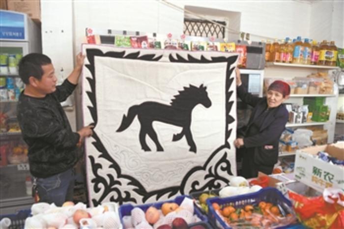 4月14日,在新疆托里縣多拉特鄉(xiāng)加瑪特村電子商務(wù)服務(wù)點負責(zé)人劉志江(左)與貧困戶馬合甫扎·阿勒木賽依提一起展示銷售的產(chǎn)品。 新華社記者 沙達提 攝
