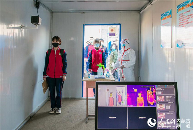 內(nèi)蒙古呼和浩特市第十二中學(xué)返校學(xué)生在測量體溫。