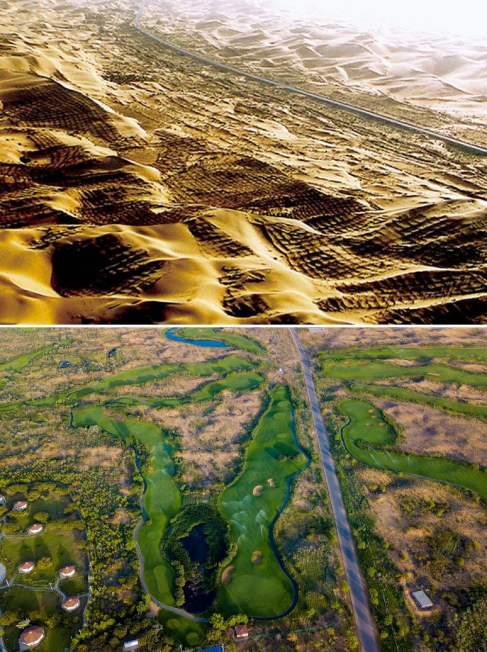 拼版照片:上圖為20世紀(jì)末的內(nèi)蒙古鄂爾多斯市杭錦旗庫布其沙漠(資料照片);下圖為庫布其沙漠生態(tài)公園的景色(新華社記者彭源2018年7月11日無人機(jī)拍攝)。新華社發(fā)