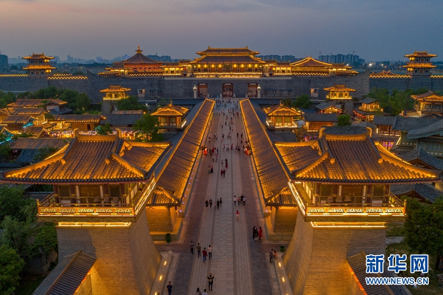 5月1日,游客在湖北省襄陽市唐城景區(qū)觀賞夜景(無人機(jī)照片)。 新華社發(fā)(楊東 攝)