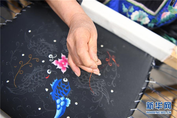 吳美金(右一)在十八洞村苗繡特產(chǎn)農(nóng)民專業(yè)合作社繡苗繡(4月24日攝)。1967年出生的吳美金,1992年嫁入飛蟲村(現(xiàn)十八洞村飛蟲寨)時(shí),只有爛泥路的飛蟲村不僅田土少,掙錢活路也少,生活十分困難。2014年,吳美金加入了十八洞村苗繡特產(chǎn)農(nóng)民專業(yè)合作社,從小就會(huì)的苗繡傳統(tǒng)手藝如今成了家庭增收的法寶,不僅在家門口就把錢掙了,同時(shí)還能照顧年幼的孫子孫女。“現(xiàn)在的日子,比年輕的時(shí)候好多了。”吳美金說。新華社記者薛宇舸攝