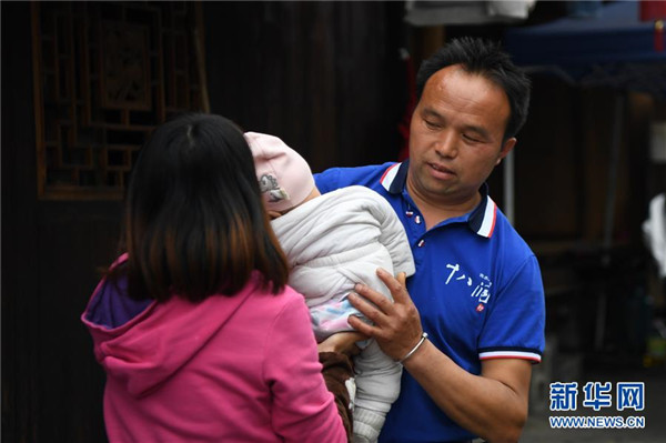 施六金(右)從妻子手中接過兒子施澤恩(4月25日攝)。1973年出生于十八洞村的施六金,由于父親患病很早就放棄學(xué)業(yè)和母親扛起了家庭的重?fù)?dān)。為了生活,他還曾遠(yuǎn)去東南亞打工。2015年,看到家鄉(xiāng)的變化,施六金回到村里開起了農(nóng)家樂,年度家庭人均純收入也從2014年的1715元增長(zhǎng)到了2019年的35696元。2018年,施六金與心愛的人組建了家庭。今年初,施六金與愛人迎來了一個(gè)大胖小子。“做人做事要懂得回報(bào)和感恩。”施六金給剛出生的兒子取名施澤恩。新華社記者薛宇舸攝