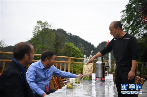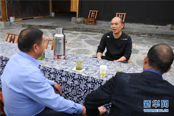 楊正邦(右)在為來自浙江的住客介紹十八洞村種植的“黃金茶”(4月25日攝)。楊正邦1978年出生于十八洞村,在外打工多年。近些年,眼看來十八洞村的游客越來越多,村里越來越熱鬧,楊正邦在2017年結(jié)束自己的打工生涯回鄉(xiāng)發(fā)展。他先是在村里擺起小吃攤,2018年開起農(nóng)家樂,去年又搭起新房子擴(kuò)建成民宿,年度家庭人均純收入從2014年的1923元增加到2019年的7173元。新華社記者薛宇舸攝