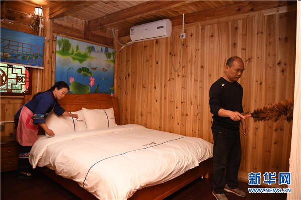 楊正邦(右)和妻子施蘭珍一起打掃民宿房間(4月25日攝)。楊正邦1978年出生于十八洞村,在外打工多年。近些年,眼看來十八洞村的游客越來越多,村里越來越熱鬧,楊正邦在2017年結(jié)束自己的打工生涯回鄉(xiāng)發(fā)展。他先是在村里擺起小吃攤,2018年開起農(nóng)家樂,去年又搭起新房子擴(kuò)建成民宿,年度家庭人均純收入從2014年的1923元增加到2019年的7173元。新華社記者薛宇舸攝
