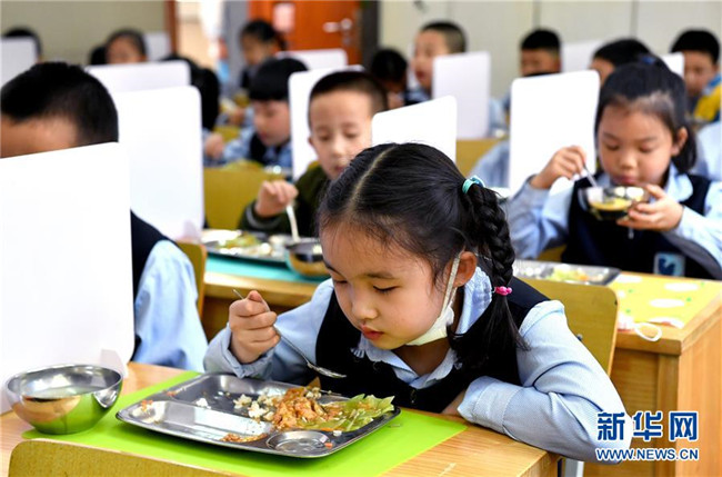 5月11日,陜西省西安市新城區(qū)后宰門(mén)小學(xué)一年級(jí)的學(xué)生在吃午飯。新華社記者 劉瀟 攝