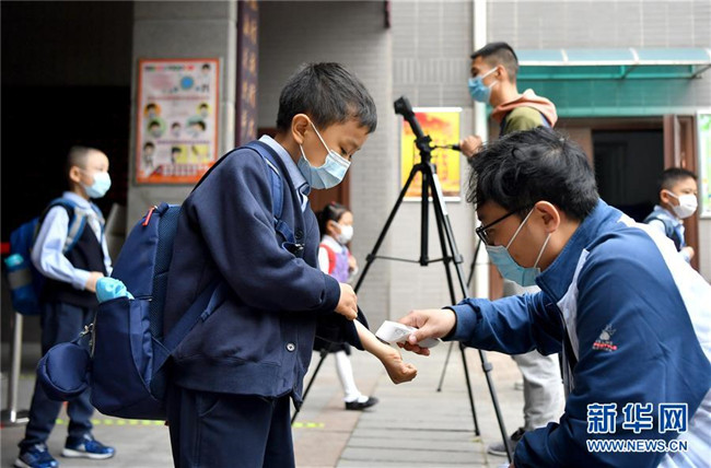5月11日,陜西省西安市新城區(qū)后宰門(mén)小學(xué)的學(xué)生進(jìn)校時(shí)測(cè)量體溫。新華社記者 劉瀟 攝