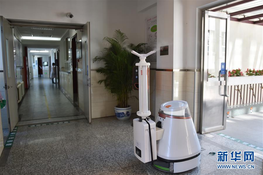 ▲5月11日,在北京市第一六六中學(xué)的走廊內(nèi),消殺機(jī)器人在工作。當(dāng)日,北京市初三年級(jí)學(xué)生開(kāi)學(xué)復(fù)課。新華社記者 彭子洋 攝