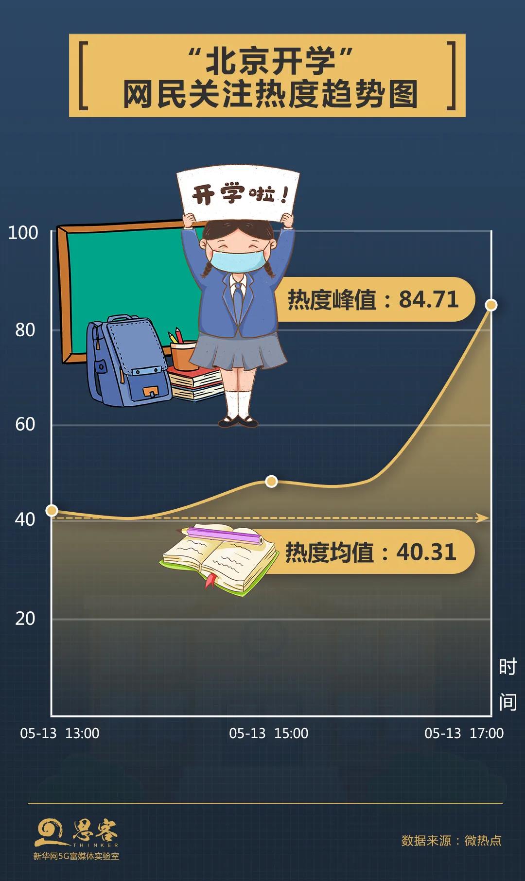 數(shù)據(jù)顯示,消息公布后,“北京開(kāi)學(xué)”話(huà)題的熱度指數(shù)迅速飆升,13日17時(shí)熱度指數(shù)達(dá)到84.71,“小學(xué)”“復(fù)課”“北京”是網(wǎng)民提及最多的詞。在相關(guān)討論中,“開(kāi)學(xué)后堅(jiān)持晨午晚檢制度”“開(kāi)學(xué)后錯(cuò)峰上學(xué)”“中小學(xué)暑假不會(huì)推遲”等話(huà)題關(guān)注度較高。