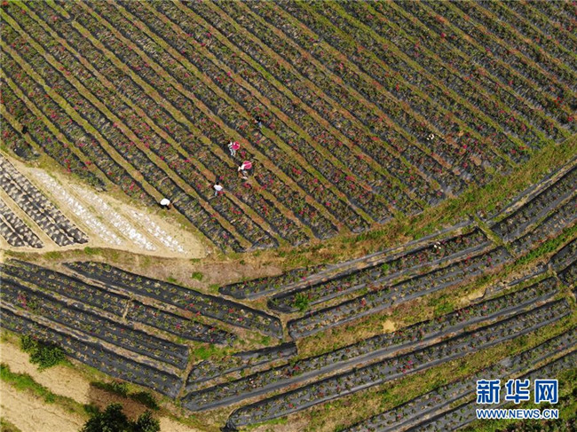 5月14日,在貴州省畢節(jié)市百里杜鵑戛木管理區(qū)中塘村鮮花基地,村民在采摘鮮花(無人機(jī)照片)。新華社發(fā)(韓賢普 攝)