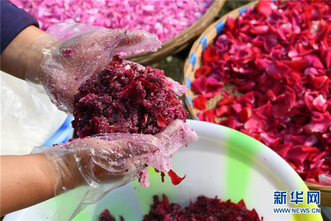 5月14日,在貴州省畢節(jié)市百里杜鵑戛木管理區(qū)中塘村鮮花基地,村民在加工鮮花糖。新華社發(fā)(史開心 攝)