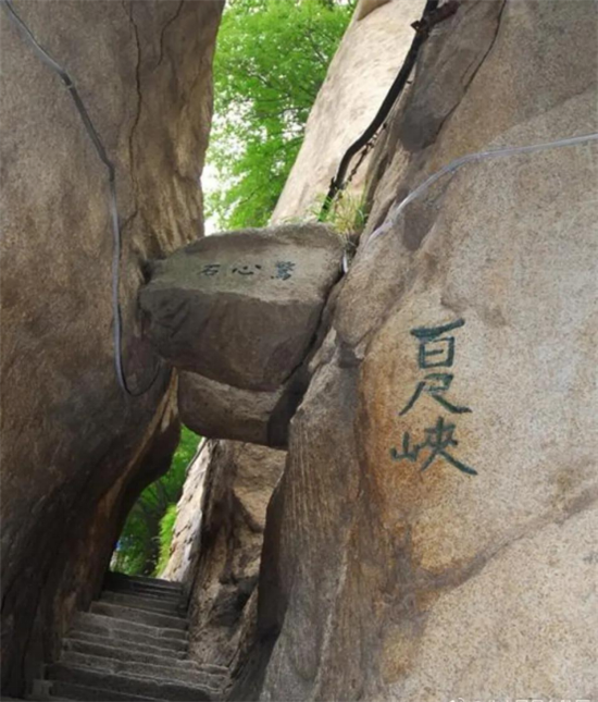 又叫“百丈崖”,兩壁欲合,卻被飛來的兩顆石塊從中撐開,分別為“驚心石”和“平心石”。人從石頭下鉆過,膽戰(zhàn)心驚又安然無恙,驚險(xiǎn)刺激。