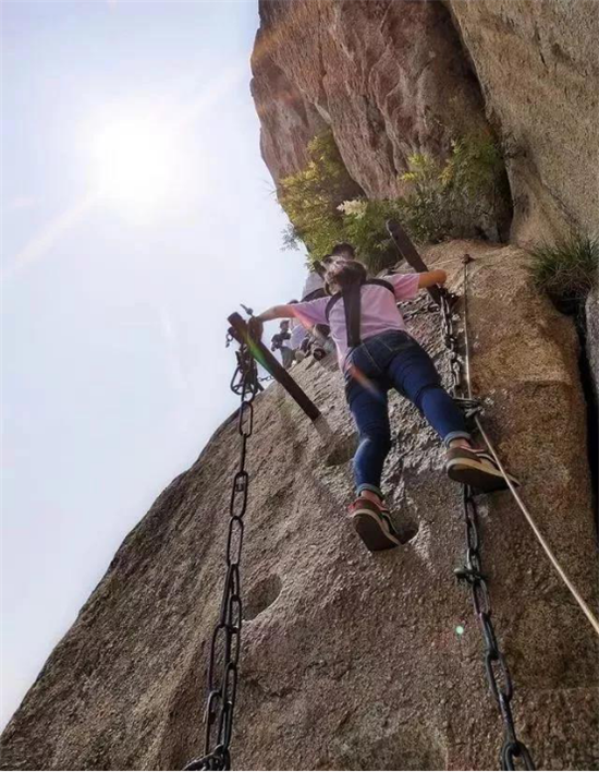 在萬仞絕壁上鑲嵌石釘搭木椽而筑,棧道上下皆是懸崖絕壁,鐵索橫懸,游人至此,面壁貼腹,屏氣挪步,被譽(yù)為“華山第一天險(xiǎn)”。